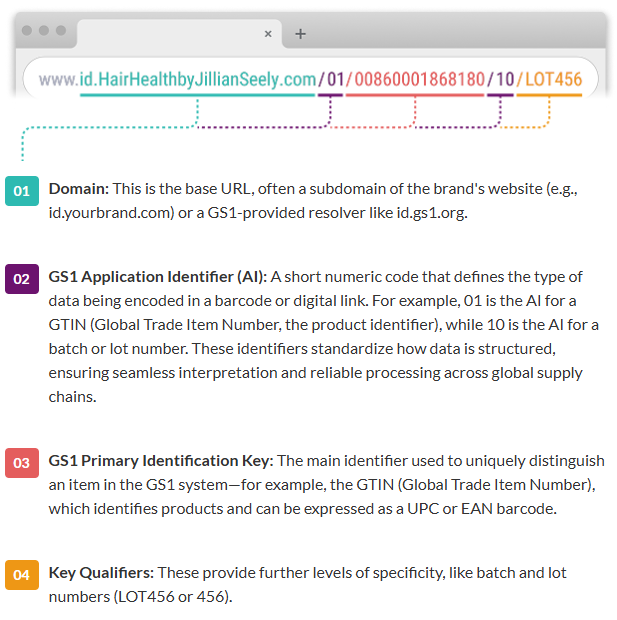 A GS1 Digital Link is a structured web address that connects a product’s GTIN (Global Trade Item Number) to digital information. It begins with a domain, uses GS1 Application Identifiers (AIs) to define the data, and can include key attributes such as batch, lot, or serial numbers. Together, these elements allow product information to be accessed through a single scan.